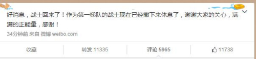 【好消息,战士回来了!作为第一梯队的战士现在已经撤下来休息了,谢谢大家的关心,满满的正能量,感谢!】据网友“东夷南夏”微博,此前留言“我爸就是你爸”的消防战士已平安归来。