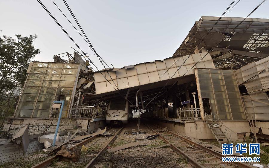 8月13日,距离爆炸现场最近的津滨轻轨东海路站被震毁。记者从事故处理现场了解到,8月12日晚,天津港国际物流中心区域内瑞海公司所属危险品仓库发生的爆炸,截至目前已造成17人死亡,32名危重伤员,283人入院观察治疗。新华社记者 岳月伟 摄 图片来源:新华网