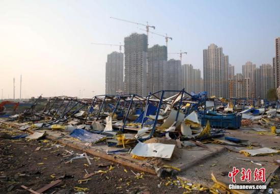 8月13日6时,爆炸事故现场旁被冲垮的简易房。8月12日晚11:20左右,天津港国际物流中心区域内瑞海公司所属危险品仓库(系民营企业)发生爆炸。中新社发 韩海丹 摄
