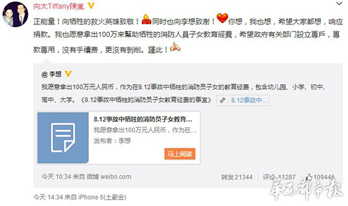 华西都市报讯(记者杜恩湖)灾难无情人有情,天津的连环爆炸,目前已导致多人伤,其中有多名消防官兵牺牲。面对这样的惨剧,香港娱乐界知名人士陈岚(向华强夫人),以及汽车之家创始人李想,带头通过微博发布消息:各自拿出了100万人民币,用于提供给在8月12事故中牺牲的消防员子女的教育经费。