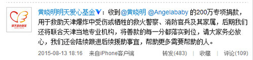 微博表示,收到@黄晓明 @Angelababy 的200万专项捐款,用于救助天津爆炸中受伤或牺牲的救火警察、消防官兵及其家属,后期我们还将联合天津当地专业机构,将善款的每一分都落实到位,请大家务必放心,我们还会陆续跟进后续援助事宜,帮助更多需要帮助的人。