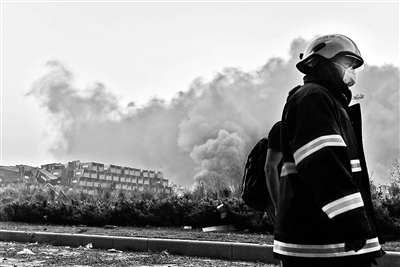 一名消防员走过浓烟 摄影/本报记者 黄亮