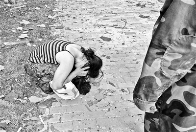 失去独子的阿姨蹲在地上给老家打电话报去噩耗 摄影/本报记者 郁骁