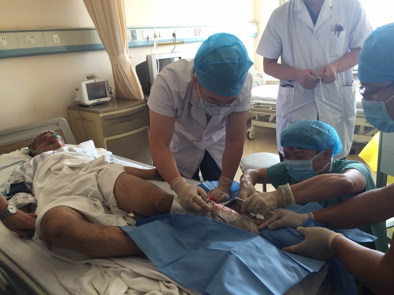 天津泰达医院为今早获救的消防队员周倜处理伤势(图)