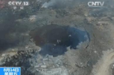 央视航拍画面:爆炸中心点被炸出深坑(图)