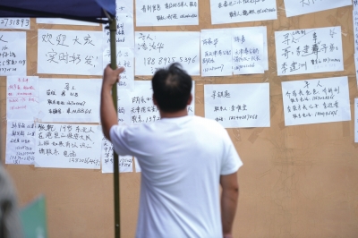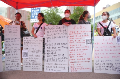 昨天下午,开发区第二小学安置点,柳先生带着女儿急匆匆地赶到校门口。他听说有当地志愿者可以帮助寻人,他请人把寻人信息写到了塑料板上,之后站在旁边,望着儿子的名字,久久不愿离开。