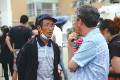 柳先生(左)正在询问安置点其他人,打听孩子的下落。