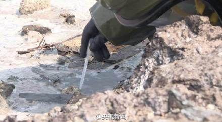 【防化团进入爆炸点 趴在地上取样】从卫星拍摄照片和航拍的画面来看,爆炸现场形成了一个明显的大坑。今天,北京卫戍区某防化团官兵身穿重型防护服,接近水边取样检测。(央视记者刘龙 马凌峰)