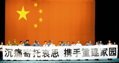 演出结束后,所有演员手持横幅走上舞台,向8·12爆炸事故遇难市民和消防战士表示哀悼。 本报记者 庞剑摄
