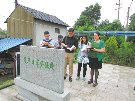 从独山港码头沿海塘向西行三公里,便到达全公亭。亭中耸立着一块青石残碑,上刻“侵华日军登陆处”。碑后的几行小字,无声控诉着日寇的侵略罪行:“1937年11月5日(农历十月初三)晨,日军在白沙湾、全公亭一带登陆,当地驻军奋起抵抗,壮烈牺牲百余人,日军侵占后,屠杀百姓500余人,烧毁民房2000余间。勒石铭记,以志不忘。”