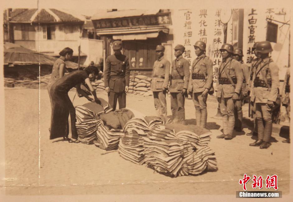 8月20日,上海市档案馆举行馆藏抗战档案发布会,向社会首次公布50件馆藏抗战档案。此次公布的档案分为“中流砥柱”、“同仇敌忾”、“罪行铁证”和“国际关爱”四个部分。图为上海市档案馆抗战档案,抗日战争时期妇女送棉衣给中国军人(1937年)。 中新社发 张亨伟 摄