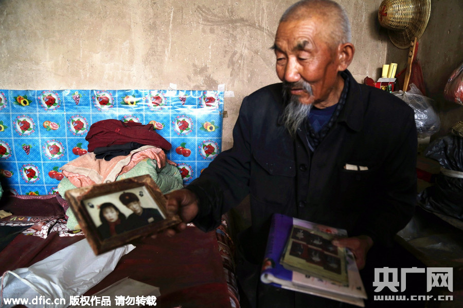 2015年5月16日,甘肃省平凉市,抗战老兵栾志堂展示自己当年与爱人的合影,照片上的他当年也很英俊、帅气。甘肃省平凉市,栾志堂老人,今年83岁,居住在甘肃省平凉市崆峒区白庙乡栾塬村。栾志堂老人在16岁时,国共双方正交战激烈,兵荒马乱中,他被国民党强行拉去顶替长兄当兵。他当时所在部队是国民党第8战区的第17集团军,主要由被誉为西北军阀“四马”之一的马鸿逵统领,后在1949年8月因国军战败,国民党部队解散,同年9月,流亡在外的栾志堂在半途被解放军第十六师四十六团一个后勤保障连连长偶遇收编。