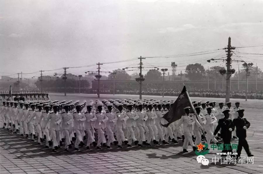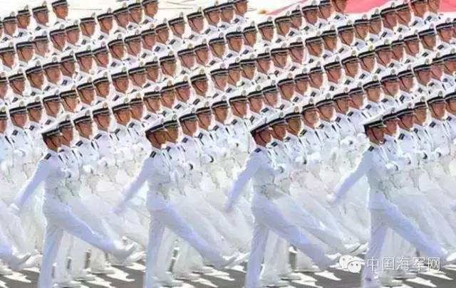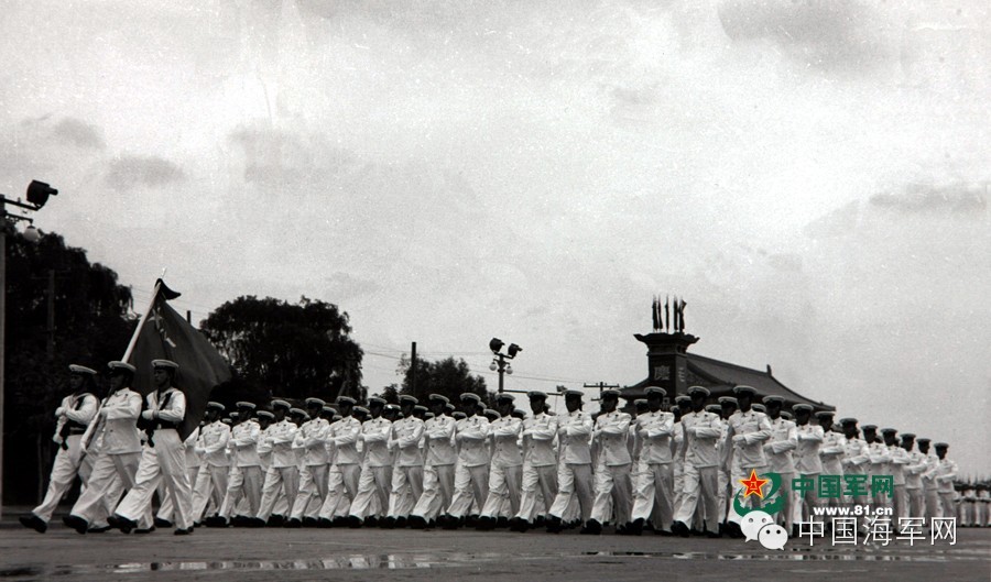 2009年大阅兵,海军学员方队犹如一艘白色军舰,劈波斩浪,一往无前地向天安门走来,由远而近,斜线到横线,从任何角度看都笔直如切,摆臂似海潮般舒展,迈步像波浪般奔腾,步步霹雳,天安门广场掌声迭起……