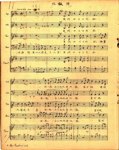 翻检泛黄的手稿,跳动的音符之间,是一位作曲家赤诚的爱国心。抗战前后,黄自创作了一大批抗敌爱国歌曲,包括《热血歌》《九一八》《军歌》《睡狮》《北望》等,当时音乐界称他为“爱国歌曲之王”。除了创作歌曲,黄自还积极投身抗日救亡运动,与国立音专师生组织抗日救国会,赴多地宣传抗日并组织募捐。