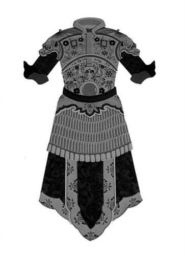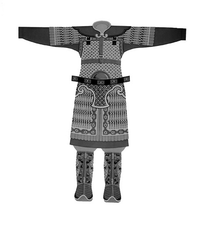 另外还有绢甲,它一般不用于实战,只是宫廷侍卫、武士的戎服,这种铠甲用图案华美的绢或织锦作面料,内衬数层厚帛制成。和皮甲、铁甲一样,绢甲上也镶有皮革、金属制造的饰件,穿着更利索、更得体。