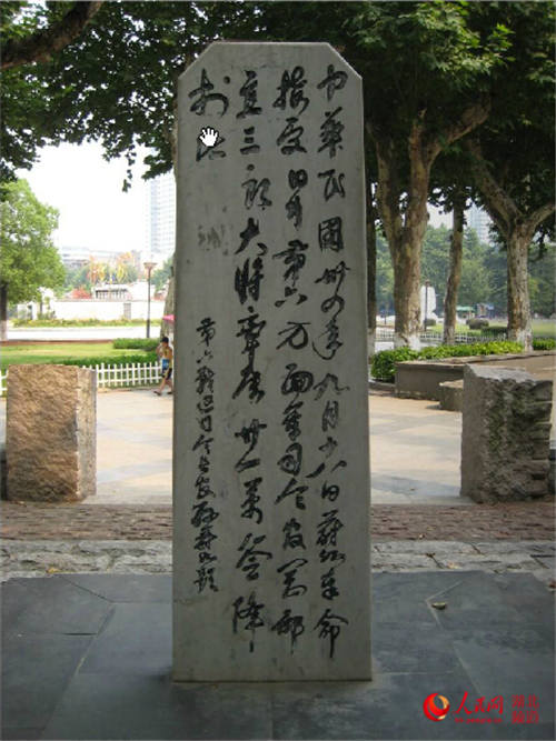 1998年5月21日,中山公园在筹备70周年园庆时,两名工作人员在距受降堂附近的张公亭底层发现一块汉白玉石碑,碑厚五厘米,长123厘米,整碑呈上窄下宽形状(上35厘米、下40厘米),刮去涂在碑面的水泥,一行碑文清晰可见:“中华民国三十四年九月十八日蔚如奉命接受日本第六方面军司令长官冈部直三郎大将率属二十一万签降于此 第六战区司令长官孙蔚如题”。