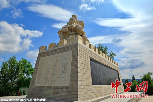 2015年6月13日,万里碧空飘着朵朵白云下的忻口战役遗址纪念墙。