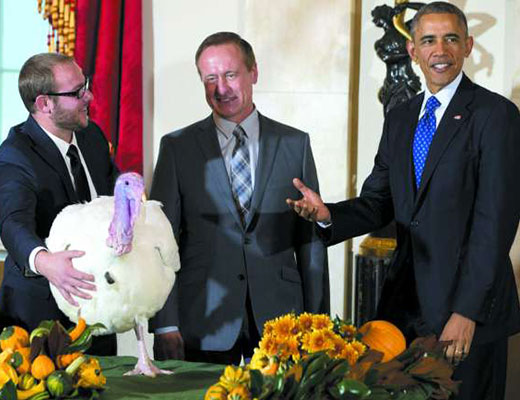 2014年11月26日,美国总统奥巴马第6次在白宫参加赦免火鸡的仪式。火鸡是美国人庆祝感恩节的传统食物,在感恩节前一天赦免两只火鸡,使其免于成为人们的大餐已成为白宫的节日传统。荣获赦免的火鸡,会被送到动物园等地“颐养天年”,直到自然死亡。每只火鸡的平均寿命大约为3到4年。