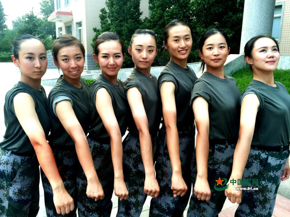 女兵们展示太阳晒过后的胳膊。杨璐 摄