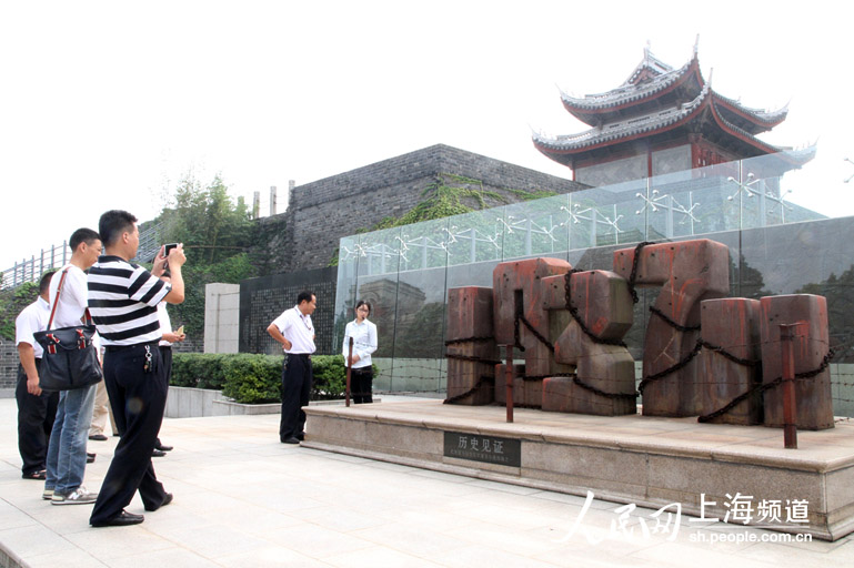 1985年9月,金山县人民政府在南安路87号建碑立亭,花岗岩碑石正面镌刻“金山卫城南门侵华日军登陆处”,背面碑文详细记述日军侵占金山卫惨绝人寰的史实。30年来,历经四次改扩建,如今的登陆处多角度呈现了日本在华的侵略暴行。(图为8月27日,讲解员向参观团队介绍雕塑《历史见证》)