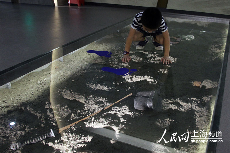 2014年12月13日,金山卫抗战遗址纪念园新建成的“金山卫抗战史料馆”对外开放。纪念馆展示了大量日军登陆金山卫城南门时的望远镜、军刀、靴子等实物。“金山卫抗战史料馆”自开放后,每月都有数千人次市民前来参观。(图为8月27日,一位小学生在纪念馆内仔细观看日军登陆实物。)