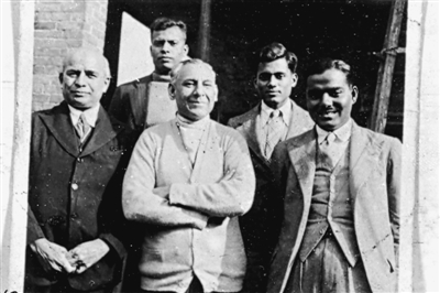 1938年,由5人组成的印度援华医疗队坐了近3周的船抵达中国。图为印度援华医疗队队员1938年在重庆的合影,右一为巴苏华,右二为柯棣华。甘泰特供图