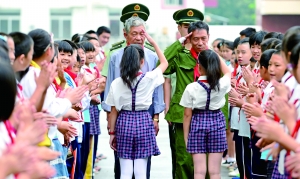 昨天,“狼牙山五壮士”英模部队的战斗英雄、三等功获得者何国和海岛老党员陈再胜来到位于海岛上的福州市吴庄华侨小学,受到孩子们的热烈欢迎。 新华社发