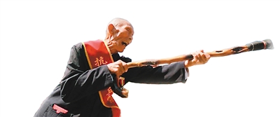 2015年8月15日,98岁抗战老兵马定新用自己的拐杖还原“拼刺刀杀鬼子”。张浪摄 中新网