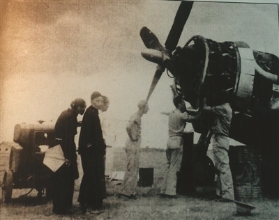 1944年8月14日,成都一机场工人和技师在修理P-47战机。资料图片