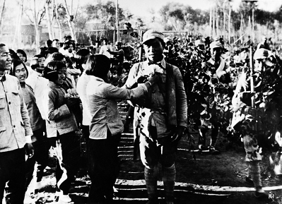 群众热烈欢迎凯旋的英雄们,为他们佩戴大红花。