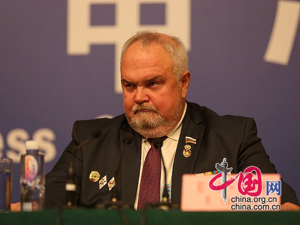 9月2日,抗战胜利70周年纪念活动新闻中心在北京梅地亚中心二层多功能厅举行第六场记者会。图为苏军著名统帅崔可夫元帅之孙尼·弗·崔可夫回答记者提问。 中国网记者 郑亮摄影