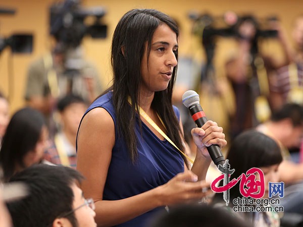 9月2日,抗战胜利70周年纪念活动新闻中心在北京梅地亚中心二层多功能厅举行第六场记者会。图为路透社记者现场提问。 中国网记者 郑亮摄影