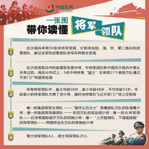中新网北京9月2日电 在9月3日上午举行的盛大阅兵中,中国56名现役中将、少将将率领徒步、装备和空中方队庄严受阅,这在共和国阅兵史上还是第一次。