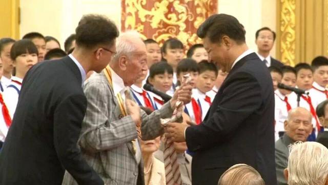 国际在线消息(记者 丁宁):2号上午,人民大会堂金色大厅,习近平主席向30名抗战老战士、抗战将领,帮助和支持中国抗战的国际友人或其遗属代表颁发中国人民抗日战争胜利70周年纪念章。令人颇感意外的是,92岁的俄罗斯老战士尤·尼·亚斯涅夫在现场佩挂上奖章后,将一条红白条纹的领带从自己脖子摘下,送给了习主席。 仪式结束后,这位老兵告诉记者,领带上有普京总统和习近平主席的名字,还有在中国作战的俄罗斯侦查员的名字。为什么要送给习主席呢?亚斯涅夫说:“习主席对老战士非常关爱、非常细心,中国政府对我们这些俄罗斯老战士也非常体贴和关心。作为一种尊敬和善意的表达,我想送给习主席这个礼物。习主席非常质朴,非常平易近人,不管对大人物还是普通人都非常好,这让我们老战士心里觉得非常温暖。”