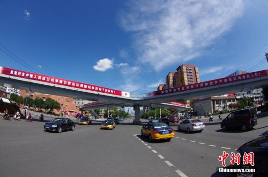 9月2日,北京市内悬挂的“纪念抗战胜利70周年”标语在蓝天白云下异常醒目。为纪念抗战胜利70周年和世界反法西斯战争胜利70周年,北京市内进行了一系列景观装饰,包括花坛、标语、建筑物景观照明等。 中新社发 贾天勇 摄
