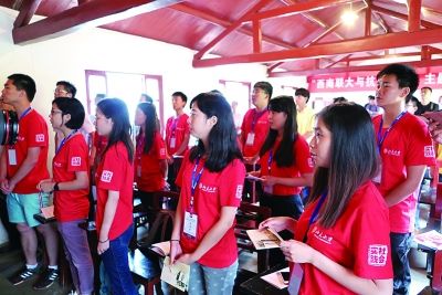 日前,苍松翠柏下,黄墙红窗中,一群身着红色队服的学生正在合唱《西南联合大学校歌》,浑厚有力的歌声打破了清晨校园的宁静。他们是北京大学“重走西南联大路,践行核心价值观”社会实践团的学生们。