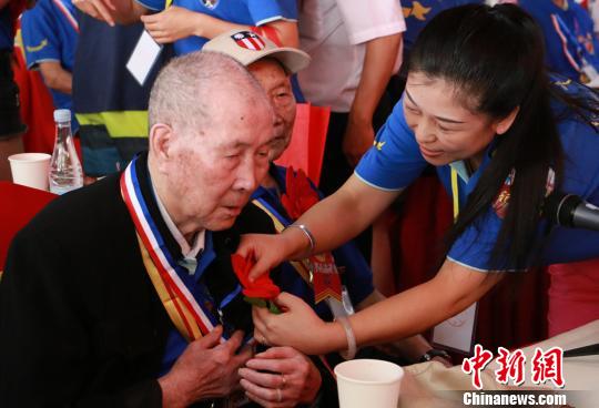 为抗战老兵佩戴鲜花。 周翔 摄