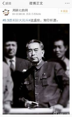 让人难忘的细节不仅仅在阅兵场上。3日上午9时30分,习近平主席偕夫人彭丽媛正在天安门迎候各国嘉宾,阅兵尚未正式开始,会场内外兴奋期待的氛围渐浓。就在此时,网友“周顾北的周”发布了一条微博“这盛世,如你所愿”,配图是一张周恩来总理的老照片。短短的七字微博引发了网友的强烈共鸣,转发已过百万。“开国大典的时候飞机不够,周总理说飞两遍,现在再也不需要飞两遍了,要多少有多少。山河犹在,国泰民安。当年送你的十里长安街,如今已是十里繁荣。”