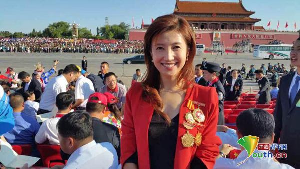 全国五一劳动奖章获得者、全国青联委员、著名主持人徐春妮在阅兵观礼台上。徐春妮供图