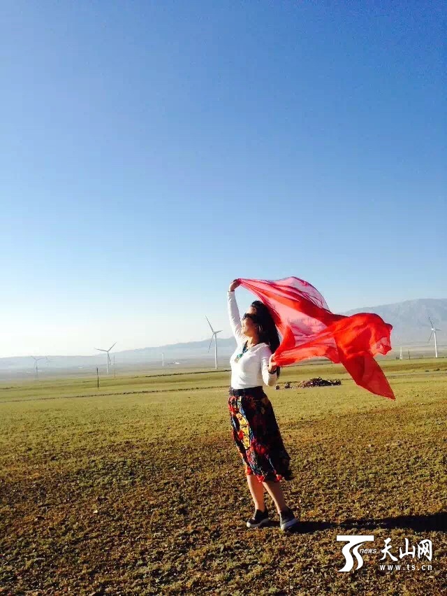 2015年8月,张婷媛回到新疆,在达坂城风力发电站拍照留念。