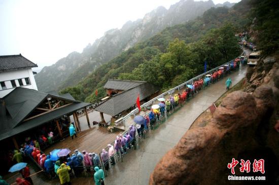10月3日,黄金周第三日,民众出行的热情高涨,在河南老君山,满山秋景宜人,吸引众多游客前来赏秋,数千名等候下山索道的游客排成长龙。据景区工作人员介绍,这些人在天黑前,难以全部下山,但游客秩序井然,没有出现骚动和过激行为。中新社记者 王中举 摄