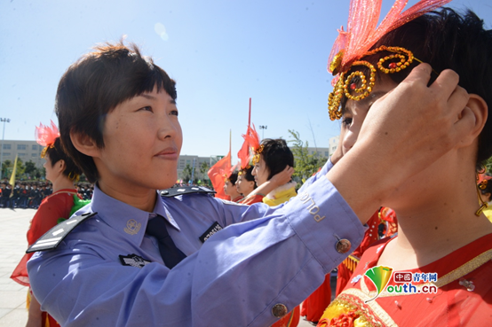 徐辉,女,41岁,山东省女子监狱一监区监区长。图为国庆汇演彩排,徐辉一丝不苟地为演员上妆。中国青年网通讯员 刘晓康 摄