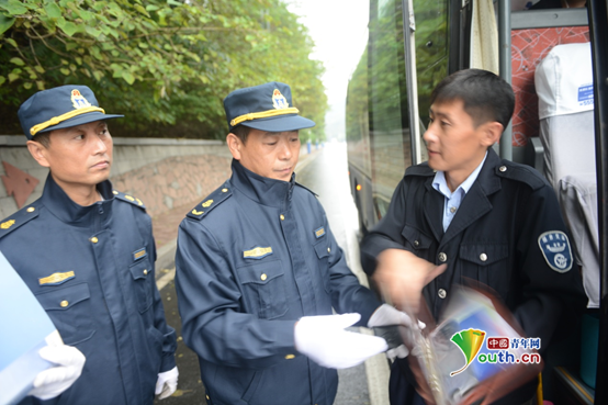 王华敏,男,46岁,烟台市交通运输监察支队监察一科科长。图为王华敏科长正在检查线路班车上的安全设施是否齐全。中国青年网通讯员 谭青海 摄