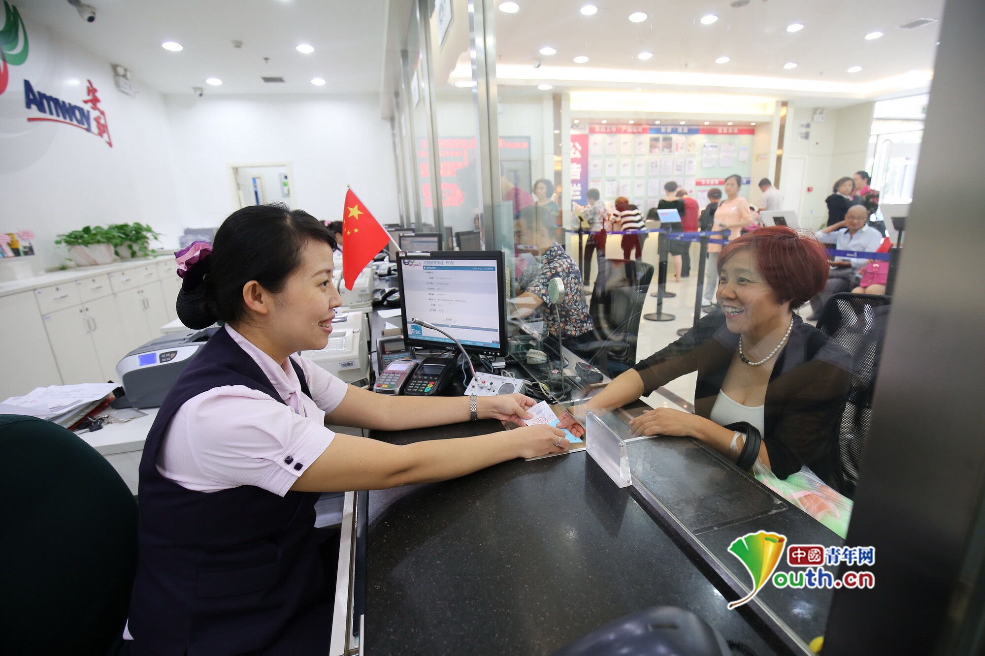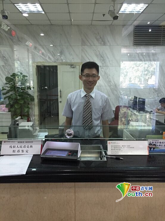 徐光陆,男,25岁,中国银行济南分行营业员。 国庆坚守岗位,“用微笑服务,为祖国庆生!”中国青年网通讯员 臧鲁嘉 摄