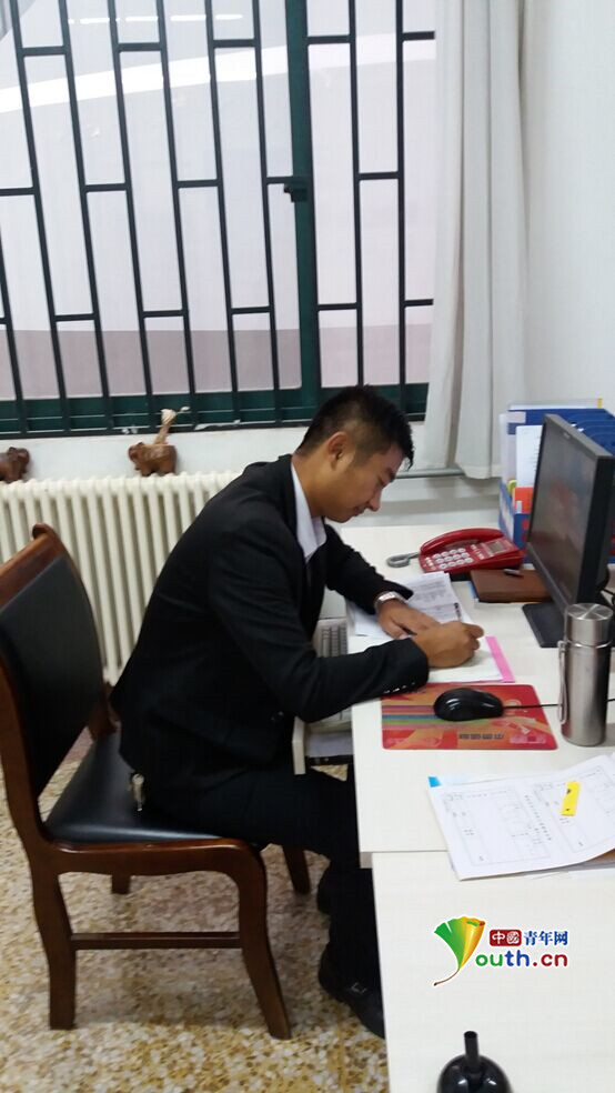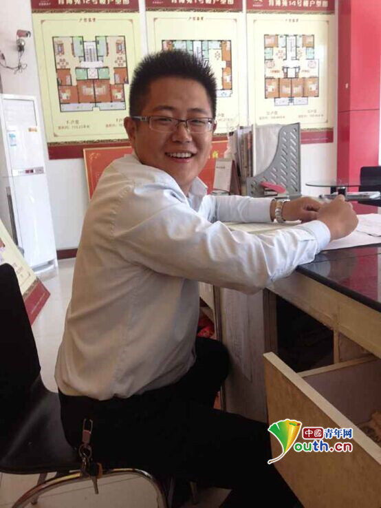 张洪亮,男, 24岁,临沂市临沭县金明寓房地产开发公司销售。“能为客户在十一期间选到适合的房源,再累也值得!“中国青年网通讯员 陈永军 摄