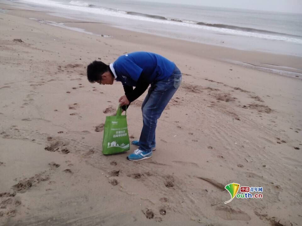 孟新翔,21岁,蓝丝带海洋保护协会青岛农业大学志愿者服务社的一名普通的志愿者,“尽管有点小冷,大家热情不减 ,依然坚守着自己的使命,清洁海岸共建美好家园!“中国青年网通讯员 满效晨 摄