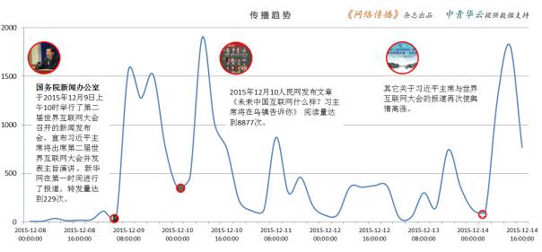 国务院新闻办公室9日在北京召开新闻发布会,引发的新闻关注呈井喷式爆发。新华网在第一时间发布了《习近平将出席第二届世界互联网大会并发表主旨演讲》的新闻。2015年12月10人民网发布文章《未来中国互联网什么样?习主席将在乌镇告诉你》再次使舆情热度升高。14日关于互联网大会相关舆情继续升温。此次大会,将会对我国互联网及相关产业,引发深远的影响。
