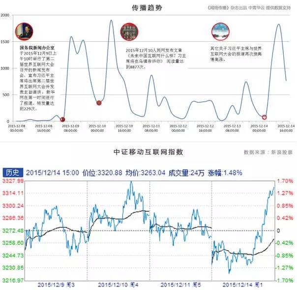 我们监测发现,最近一周,中证移动互联网指数涨跌趋势与习主席参加世界互联网大会的新闻传播趋势惊人的一致。