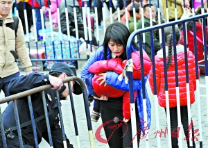 有序进站孩子骑在大人的肩膀上慢慢进站。广州日报记者廖雪明 摄