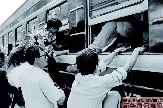 他的每一句话几乎都有影像印证,在1995年拍摄的西宁车站站台上,有的人正在拼命往窗里爬,有人刚刚爬进去。